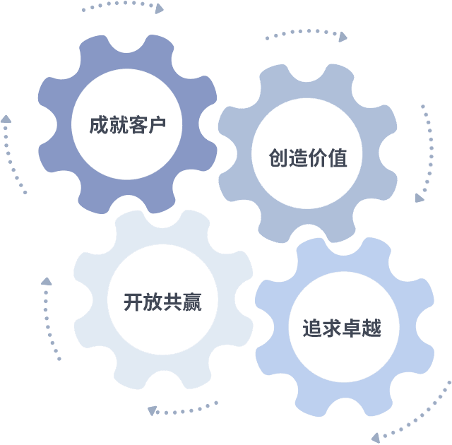 成就客户是一切决策的出发点,,创造价值是衡量所有工作的标准,,,,追求卓越是我们做事做人的态度,,开放共赢是我们的格局也是最终的结果。。价值观的齿轮环环相扣,,推动着组织里的每个人不断向前。。。