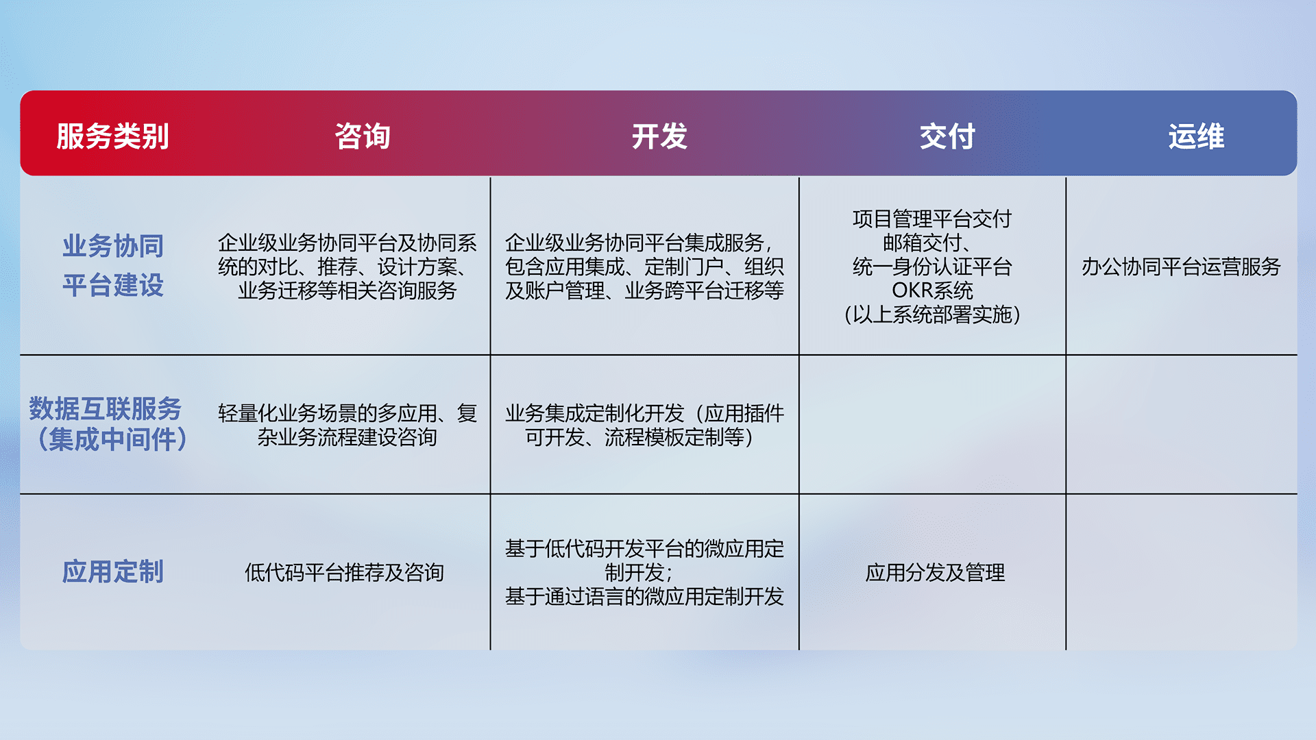 针对钉钉、、企微、、、、IDaas等平台级产品提供产品的规划、、方案、、、交付、、定制化开发等服务,,,,实现如统一协同办公、、智能客户服务、、、混合会议管理、、、、智能数据查询、、、、等业务场景,,,实现数字化转型。。。