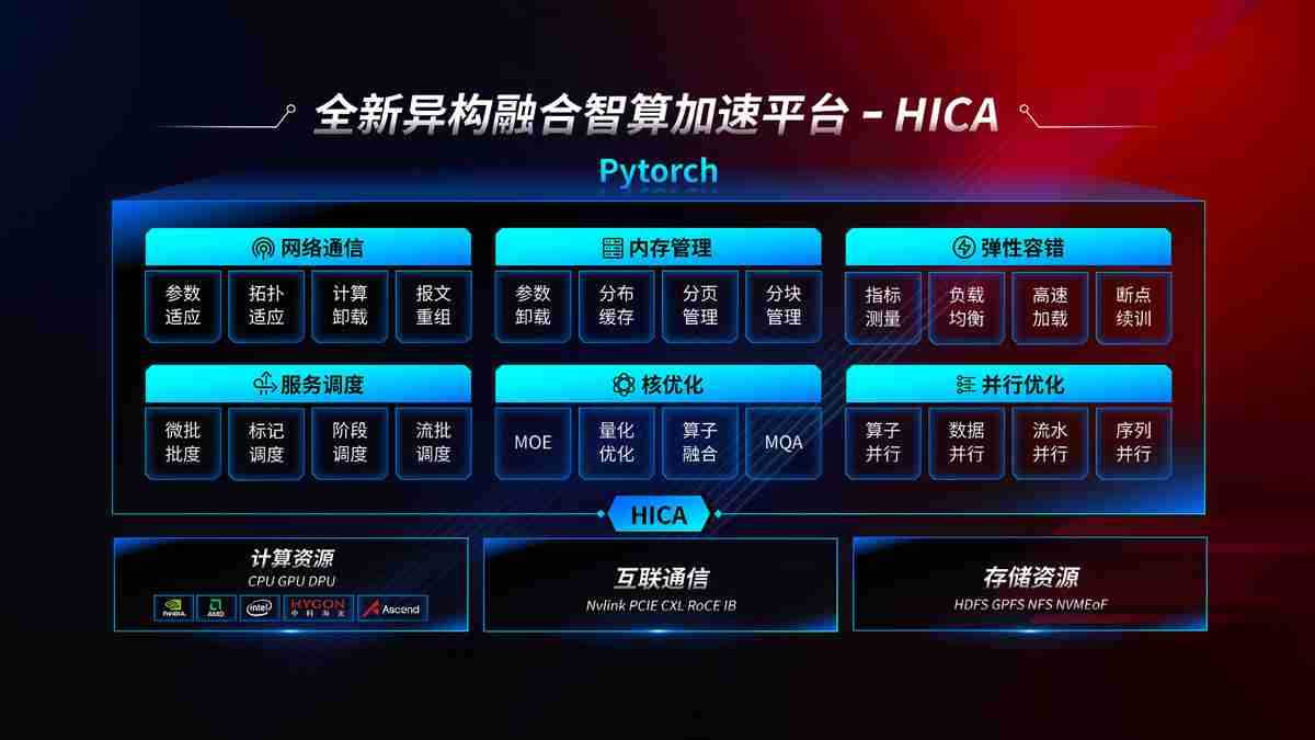 通过自研的服务层、、中间适配层、、、、以及调度编排算法,,,,采用数据并行、、、模型并行等多种并行方式,,,把并行计算任务进行有效的分解,,,,使其分别由相应的软件栈和算力资源来承接。。。当GPU资源变化,,,,HICA可以实时动态调度计算子任务并调整模型拓扑和架构,,以充分聚合各种算力资源。。